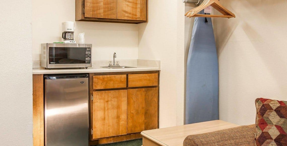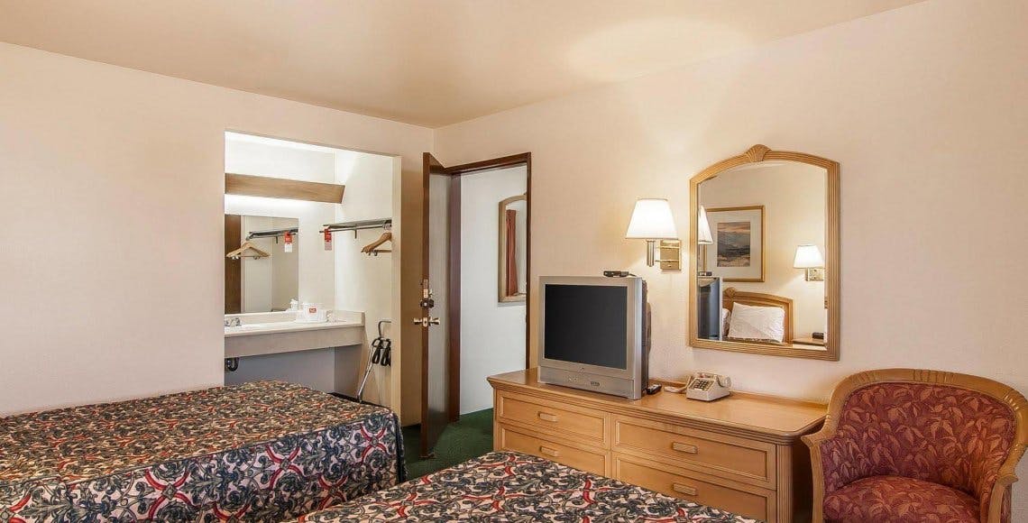Two double beds with chair, desk and mini-fridge. Separate room with pull-out sofa, desk and TV. One and a half bath.